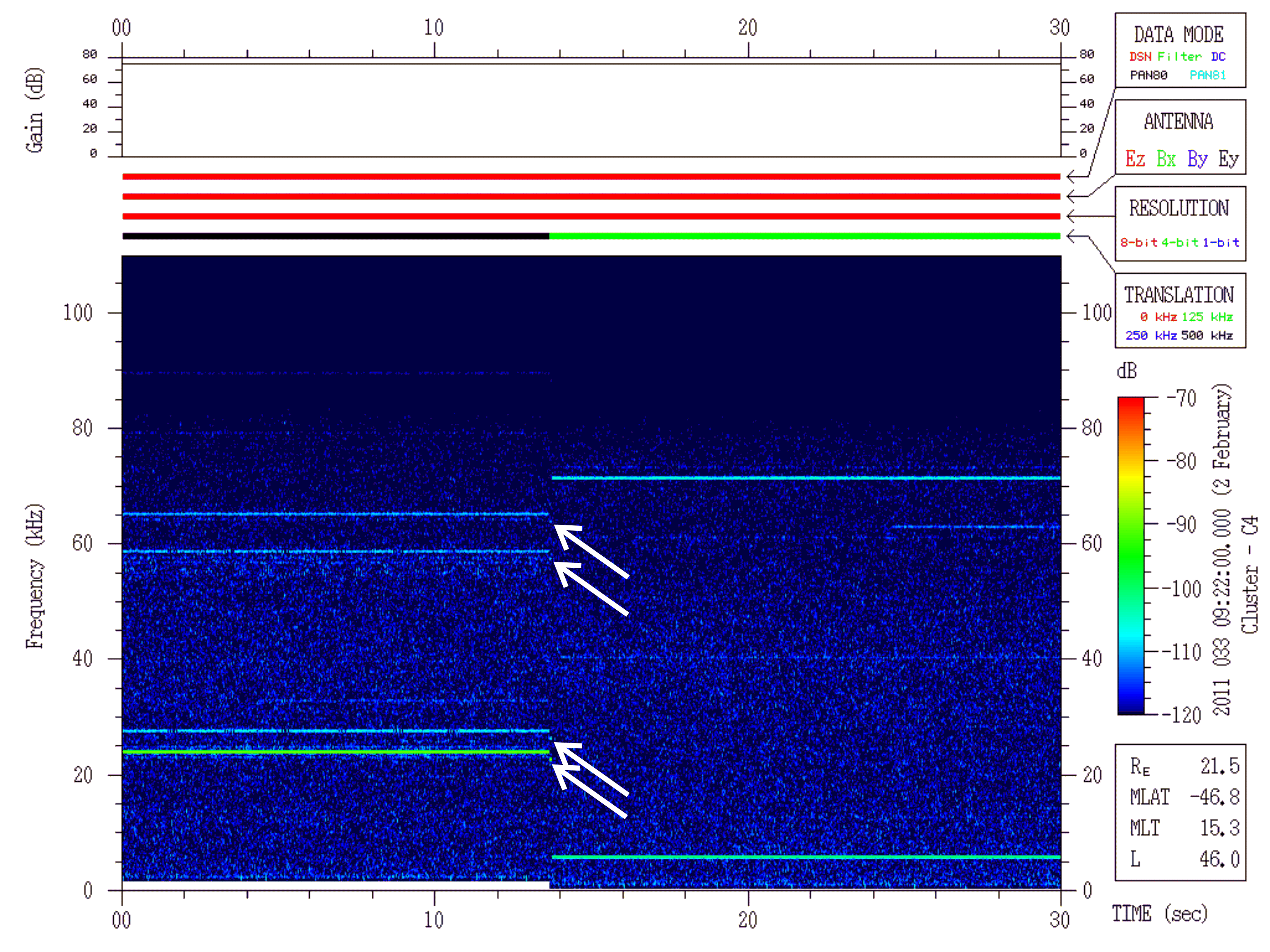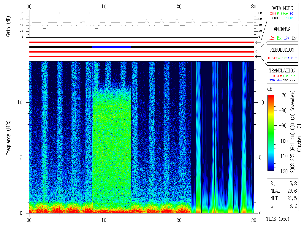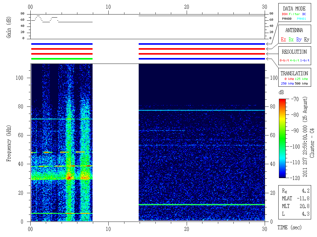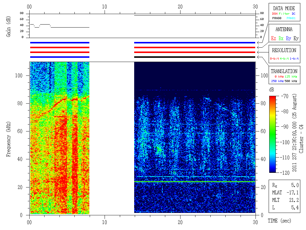 In addition, all the other status bits (antenna, bandwidth, conversion mode, data resolution) are reported only once per major frame, making it possible for a change to actually take place in one minor frame but reported earlier or later by up to three minor frames depending on when the change occurred in relation to when that status byte was sampled in the major frame. Thus, there is the possibility that the mode reported/shown during times of mode changes could be in error by up to 119.1 ms (3 minor frames). An example of this can be seen in Figure 2 below, where the mode switch from the 500 kHz conversion mode to the 125 kHz conversion mode (fourth horizontal bar in the middle panel going from black to green) appears to have been reported in the status bits as occurring at least one to three minor frames before the mode switch actually took place. This is obvious from the interference lines seen at the start of the plot at about 24, 27, 58 and 65 kHz as seen on the left vertical scale (which are actually 524, 527, 558, and 565 kHz when the 500 kHz conversion frequency is added) shifting down to slightly lower frequencies at about the 12 s mark on the horizontal axis. The interference lines observed before the shift down in frequency are the same ones as observed after the shift since their frequencies do not change. This implies that the status bits reported a premature switch in conversion mode by up to three minor frames. This shift down in frequency is also consistent with the shift down of the entire spectrum seen around 0-2 kHz at the 12s mark. The entire spectrum shifts down due to the different frequency calibration for 500 kHz vs. 125 kHz.