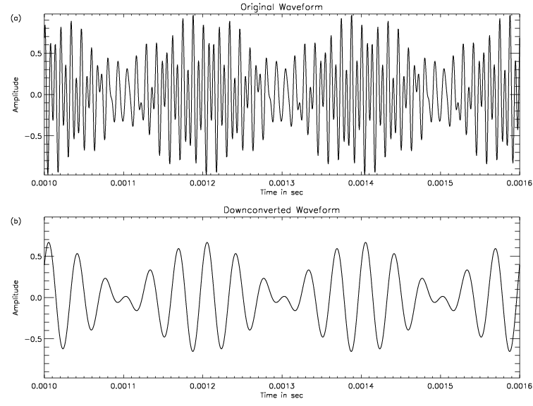 When data are obtained in any of the frequency conversion modes (when the lower edge of acquired frequency band starts at approximately 125 kHz, 250 kHz or 500 kHz), a key part of the process within the WBD instrument is to downshift the frequency components of the raw analog signal, through a combination of filters, so that the lower edge of the desired band is instead at 0 kHz. This process is called downconversion. It is this downconverted signal that is then digitized to become the WBD data set. This process preserves the frequency information in the signal (spectrograms of the original signal are easily recovered by simply adding the amount of downshift back on to the frequency values when plotting or analyzing), but it necessarily does not preserve the shape of the waveform. This means that when these downconverted data are plotted as amplitude vs. time, the result is the waveform of a signal with frequency content of ~0-9.5 kHz, ~0-19 kHz or ~0-77 kHz (depending on the bandwidth selected prior to obtaining the data), not the waveform of the original signal that existed in the higher frequency band. This can cause the time scale of waveform features to be significantly different from what the user might expect, so extreme caution needs to be taken when analyzing such waveforms.