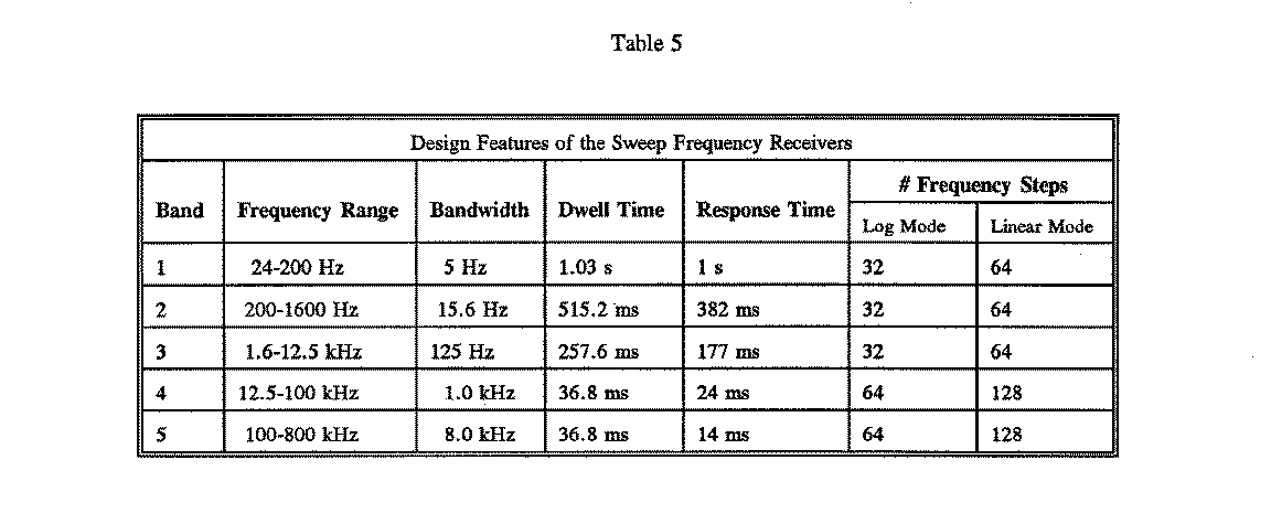 Only data from the SFR are used to derive the PWI key parameters. The SFR consists of two single-sideband, phase matched, double-conversion receivers in parallel, with both amplitude and phase-measuring capability. The SFR provides amplitude and phase measurements in five frequency bands from 26 Hz to 808 kHz. Each receiver can be connected to one of four sensors, as listed in Table IV(a) of Ref. 1. Design features of the Sweep Frequency Receivers are provided in Table V of Ref. 1 and in the table labelled Design Features and Modes of Sweep Frequency Receivers.