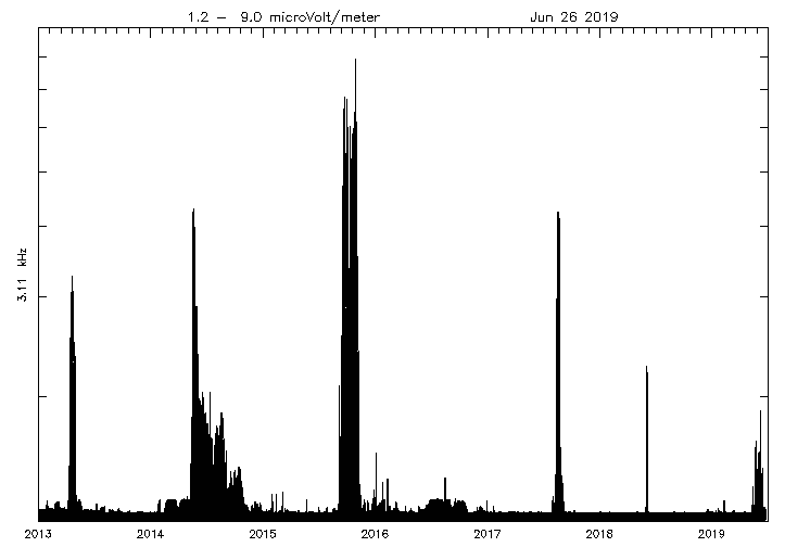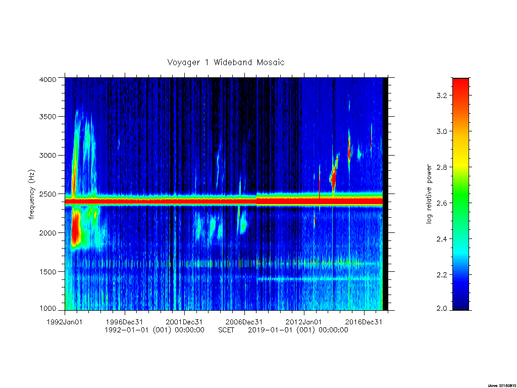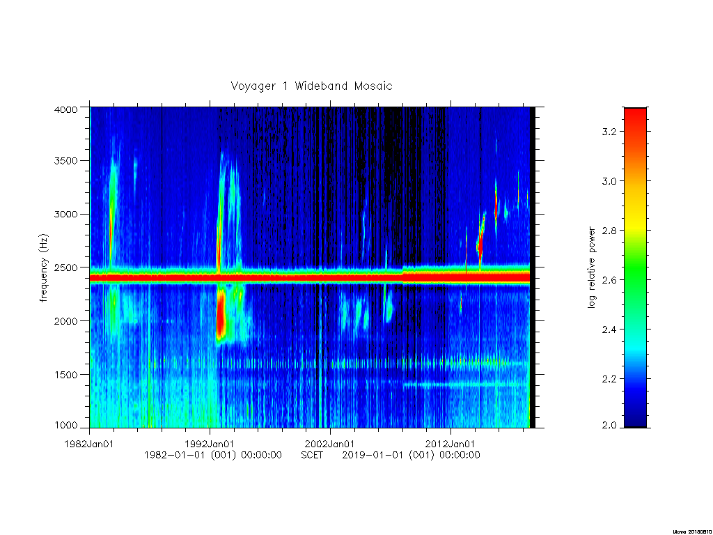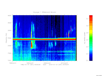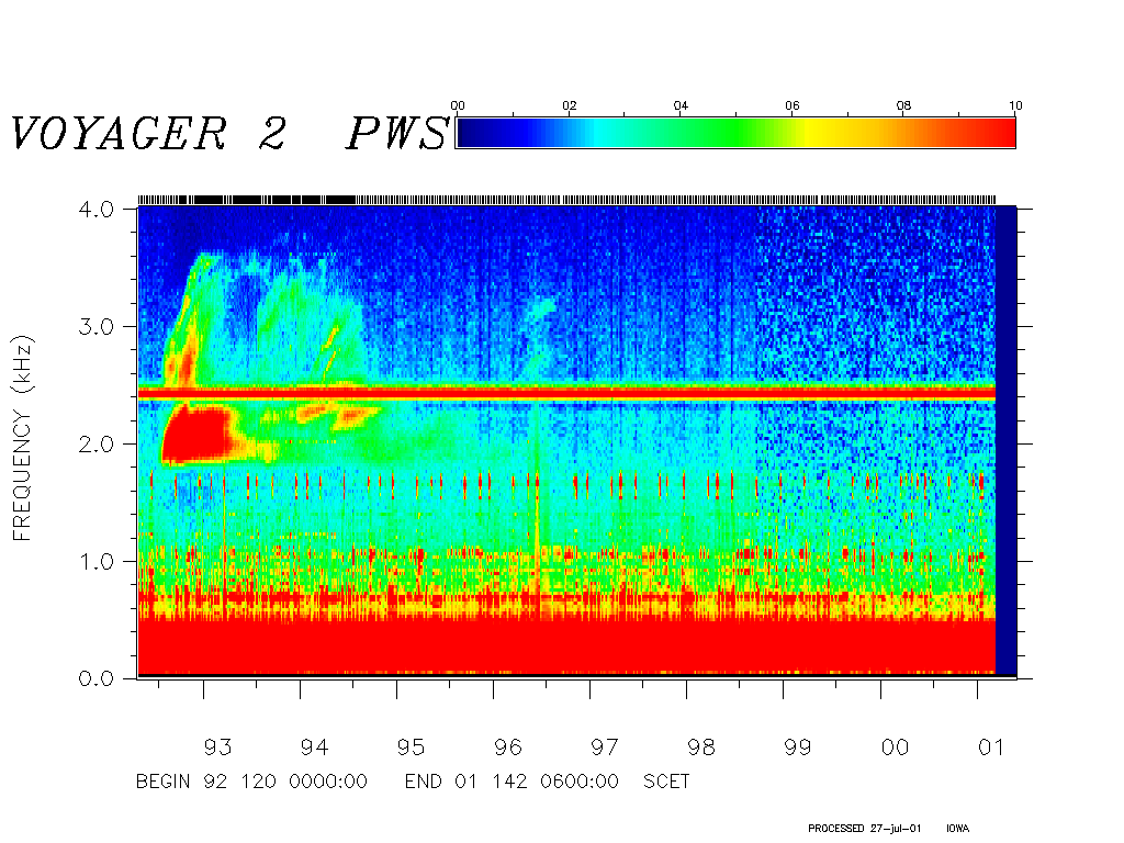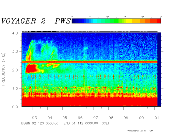 Note that beginning around day 140 of 2001, the Voyager 2 wideband receiver began exhibiting degraded performance. This degradation has continued and we have little hope that the situation will improve. Data received after this time is complicated by artifacts of the degradation and decreasing sensitivity, hence, we have chosen to not include the degraded data in this spectrogram.